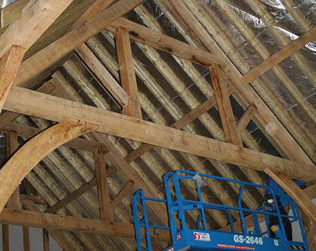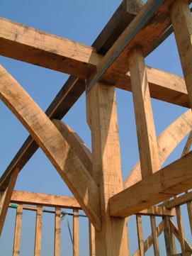 Though the rafters are in treated softwood to save cost, the collars and purlins are in oak.