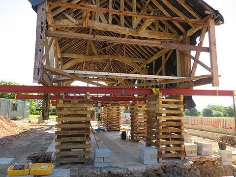 Renovation work begins on this old granary/maltings barn. We have jacked it up while the ground work is being put in place and then we can safely start on the timber repairs. It is supported on steels which will be utilised in the new additions to the barn, and timber cribbs which form part of the jacking and levelling process.