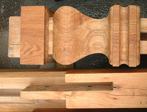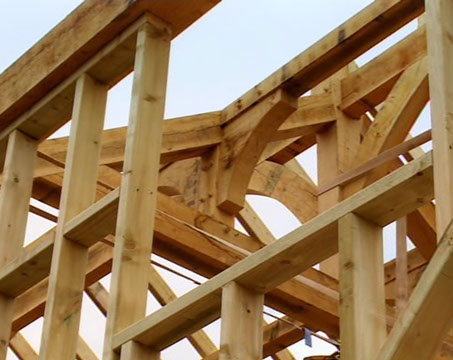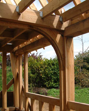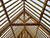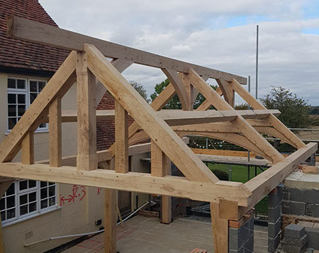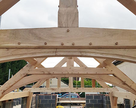 Oak roof frame for feature design in a new kitchen extension. With moulding to the bracing and main trusses.