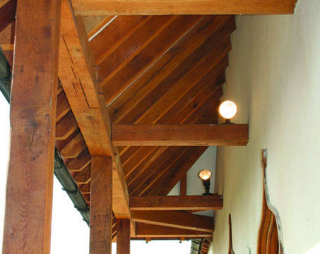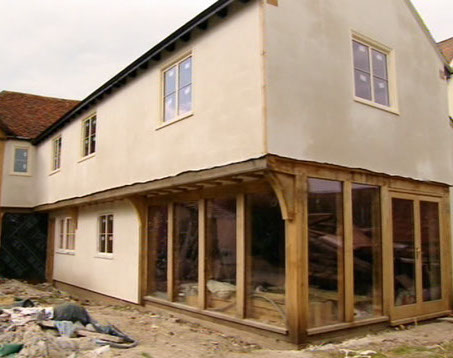 Farmhouse renovation and extension, working with client's own architects. Photograph shows extension to original farmhouse in oak. Panels fabricated in the workshop made in softwood insulated with sheeps wool.