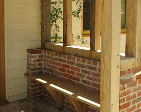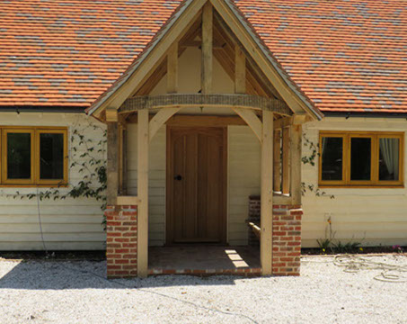 Bespoke design for a green oak porch to suit this pretty country cottage. The porch is generously proportioned to include oak seating on both sides. We also made the front door - a traditionally boarded door with a heavy oak frame.